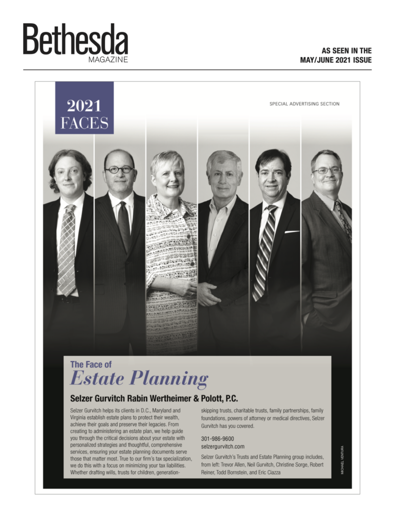 Bethesda Magazine: Selzer Gurvitch Named “The Face of Estate Planning” In the Press | Jul 1 2021 | Estate Planning / Trust & Estate Administration Related Practices Estate Planning / Trust & Estate AdministrationSelzer Gurvitch is proud to be recognized as “The Face of Estate Planning” in the May/June 2021 issue of Bethesda Magazine.